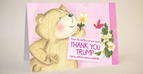 Our Thank You Trump card was signed by hundreds of women and men at the anti-trump march. We then delivered it to him at his golf course in Scotland. We didn’t hear anything back from him, unfortunately.